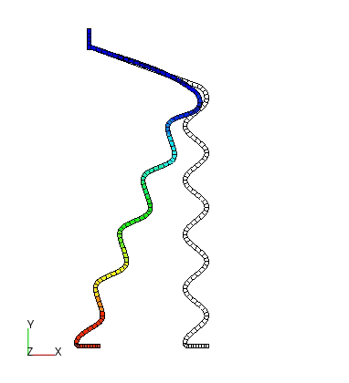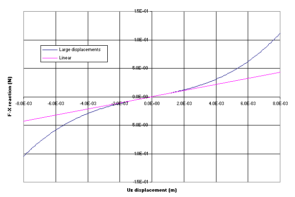 At small displacements the strains and rotations are assumed to be infinitesimal and the load displacement response is linear; as can be seen by the central linear section of the large displacement graph (blue line). When the deformation includes large rotations, the assumptions of linear theory are no longer appropriate, and it becomes necessary to choose a more accurate strain measures (objective). The large displacement solution shown opposite is based on a total Lagrangian formulation using the logarithmic strain. |