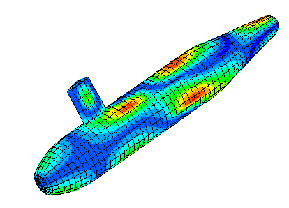 A submerged vessel can be modelled with a structural shell mesh coupled to a boundary element representation of the surrounding fluid medium.